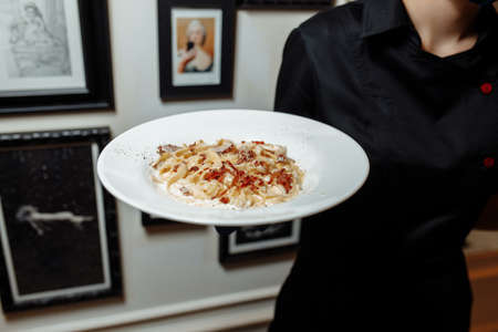 carbonara pasta with lots of cheese on a white plate. Waiter with a plate of carbonara pasta.