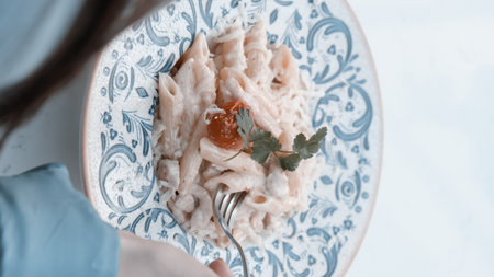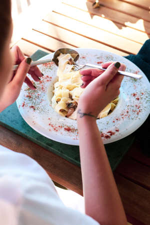 Italian pasta with chicken and cheese in a large white plate with young woman's hands holding a knife and a fork over it