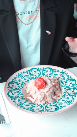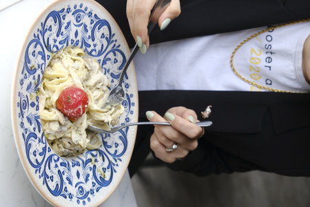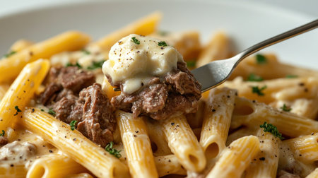 Enjoying a forkful of creamy pasta topped with succulent beef and fresh herbs.