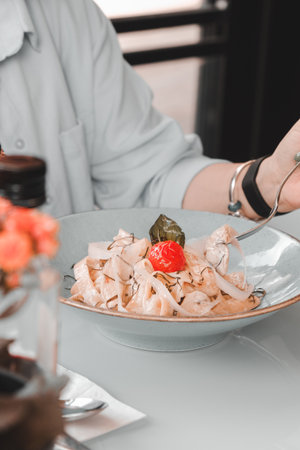 Tasty appetizing classic pasta with a delicious sauce in a restaurant.