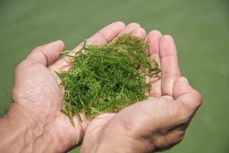 Photo of green seaweed carried by sea waves in the hand, Mexica