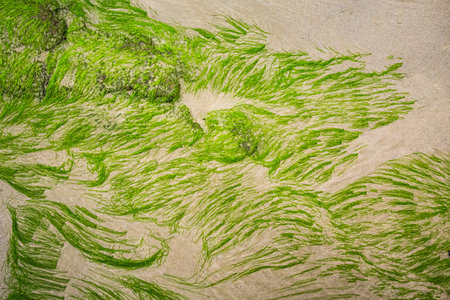 greenery background of underwater grass at low tide on the ocean coast in spring