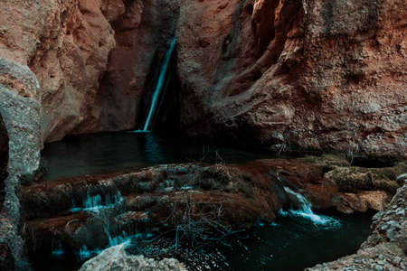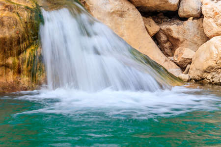 Small waterfall among the rocks in oasis of Chebika near Nefta at Sahara desert, Tunisia. Motion blur water