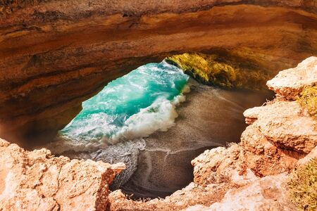 rocks on the famous Benagil beach in Portugal, waves on the beach, view of the gorge, the raging ocean