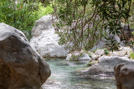 Tranquil river flowing between large white boulders, viewed through overhanging olive branches, in a serene woodland. High quality photo
