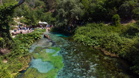 overhead view of dimosari waterfall lake with happy woman floating on the back Lefkada island Greece