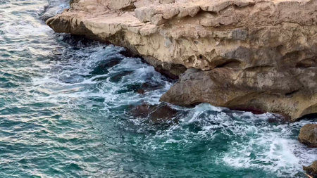 A stunning view of rugged cliffs meeting turquoise ocean waves, perfect for coastal themes and aesthetics