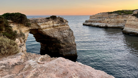 Viewpoint of the natural arches, orange cliffs and turquoise waters, at sunset. Concept of tourism and travel. Algarve, Portugal