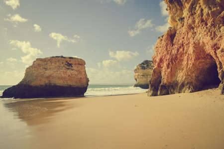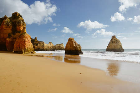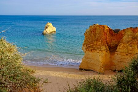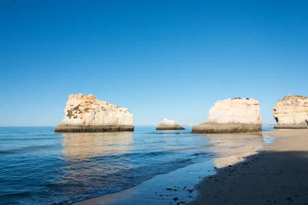 Beautiful view of beach of Three Brothers with no people. Algarve, Portugal. Europe