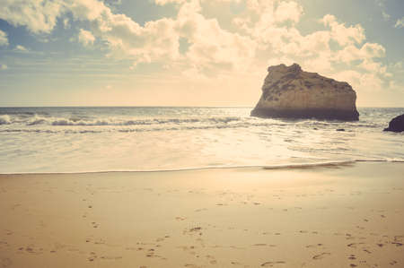 beautiful Atlantic ocean view horizon with sandy beach, rocks and waves at sunrise. Algarve, Portugal