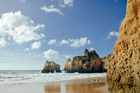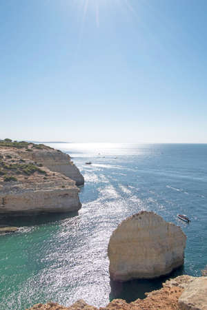 Landscape of the rocks, cliffs and ocean beach coastline Algarve Portugal, Europe. Sunny day, 2018. Panoramic nature beauty seascape, sunshine view