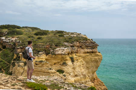 one slender guy is standing on a rock in Portugal. guy looks into the distance, ocean view