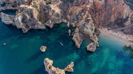Aerial view of cliffs and beach near Lagos city in Algarve coast at Portugal