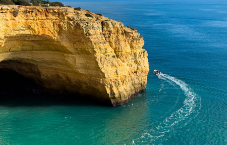 beautiful ocean view with motorboat and cliffs, Algarve region, Portugal