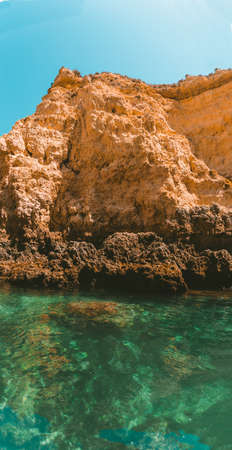 Rocks on the shore of Atlantic ocean in Algarve, Portugal. Beautiful summer seascape, famous travel destination