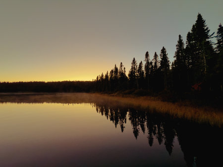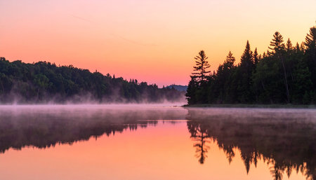 Lake of two rivers in algonquin national park ontario canada sunset sunrise with fog foggy mystical atmosphere background