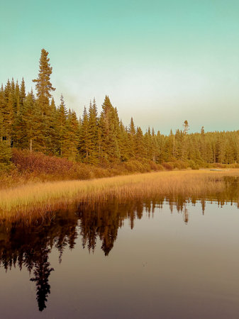 Canadian Landscape view by the lake during Fall Season. Colorful Sunrise Sky Art Render. Taken at Grand Lake Flowage, Nova Scotia, Canada.