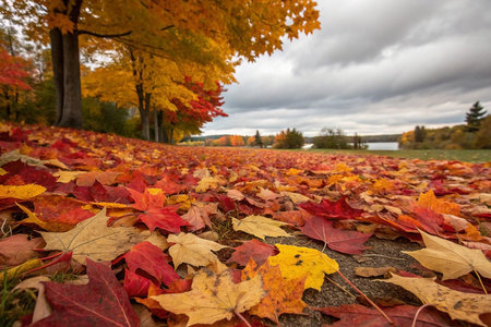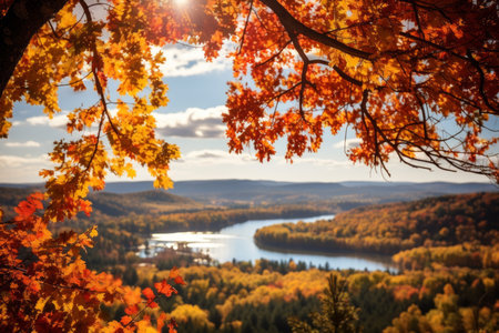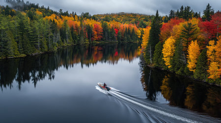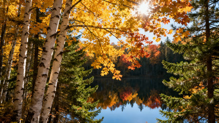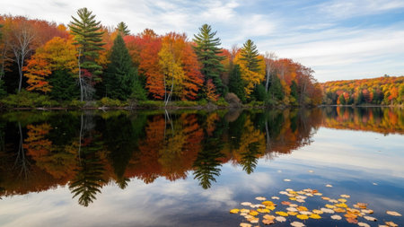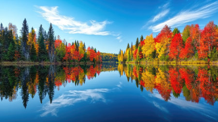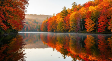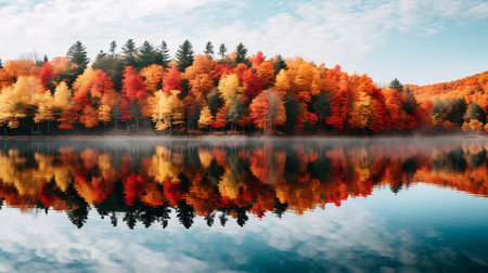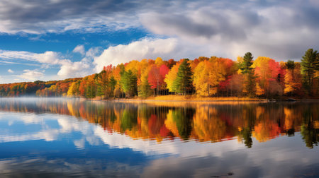 a still lake reflecting the vibrant hues of the autumn foliage, created with generative ai