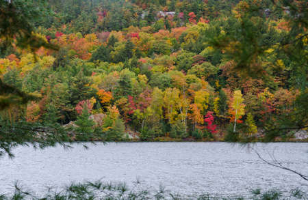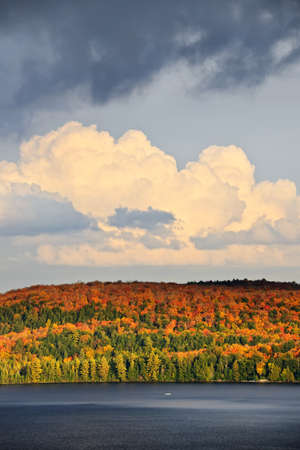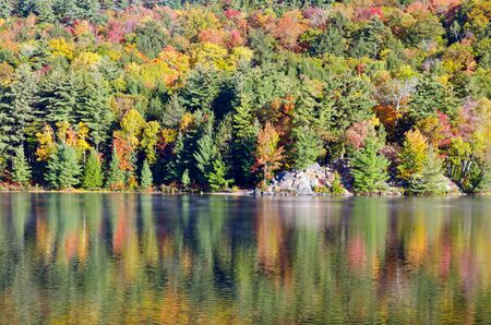 Fall forest trees with colorful autumn foliage on calm blue lake shore in Algonquin Provincial Park, Canada