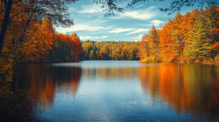 A stunning autumn scene featuring vibrant trees reflecting on a serene lake. Perfect for capturing the essence of nature's beauty during fall.
