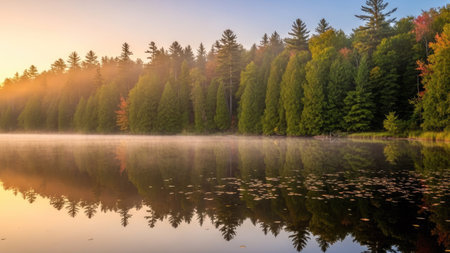 Calm lake perfectly reflects the vibrant autumn foliage and a clear blue sky, with fog gently lifting off the water during early morning hours.