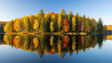 A picturesque autumn scene featuring a forest of vibrant trees reflected perfectly in a calm lake, creating a symmetrical and tranquil view.