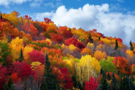 Mountain covered in vibrant, colorful trees during autumn season, A hillside ablaze with the fiery colors of autumn