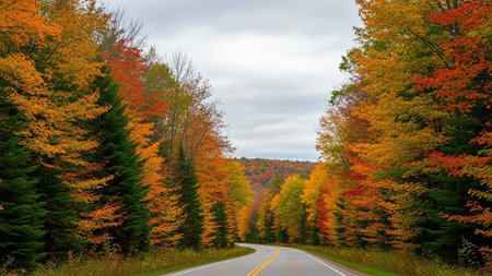 A serene drive through a picturesque autumn landscape displaying vibrant colors of foliage. The winding road offers an inviting escape into nature's beauty.