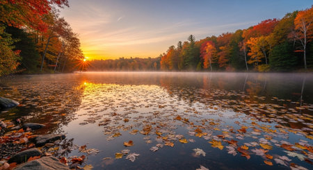Serene lake embraced by vibrant autumn foliage at sunrise a perfect print for nature lovers
