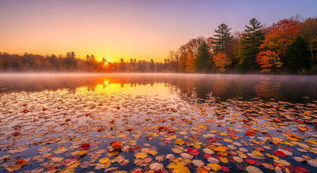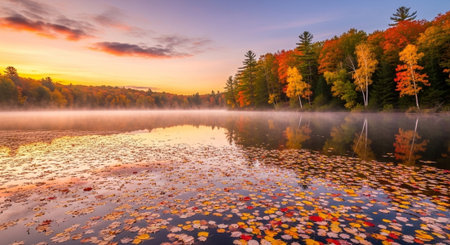 Autumn landscape with foggy lake and colorful trees at sunrise.