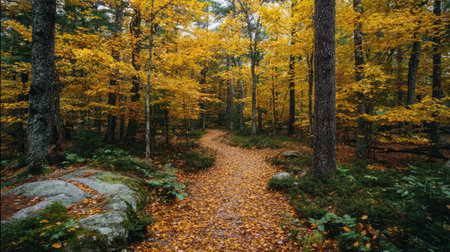 A picturesque autumn scene featuring a winding pathway surrounded by trees adorned with vibrant golden leaves. The serene atmosphere invites exploration.