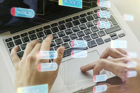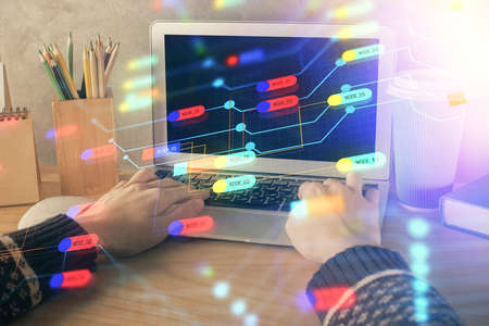 Double exposure of woman hands working on computer and data theme hologram drawing. Tech concept.