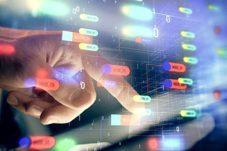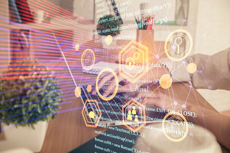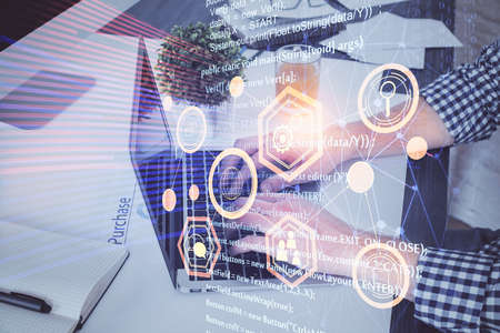 Double exposure of data internet theme hologram with man working on computer on background. Concept of innovation.
