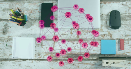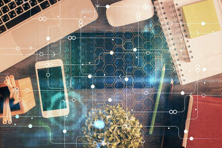 Double exposure of technology theme drawing over work table desktop. Top view. Global data analysis concept.