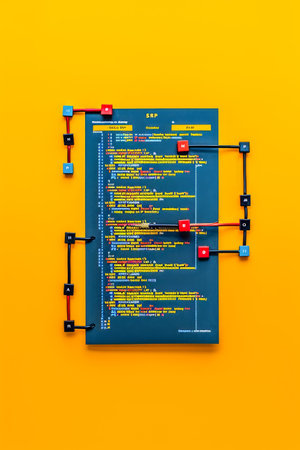 Abstract Technology Concept with Circuit Board and Coding Scripts on Vivid Yellow Background AI Generative