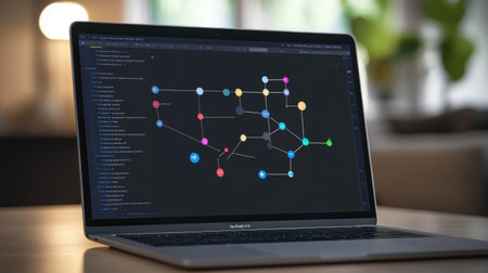 A laptop displaying a colorful software development flowchart sits on a desk in a modern workspace, illuminated by natural light, showcasing creativity and technology.