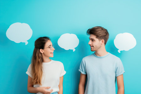 Young couple with speech bubbles on blue background, talking and looking at each other