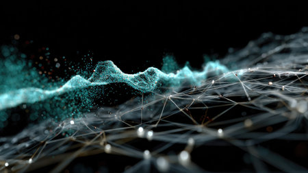 This abstract technology image features particles and connecting lines, creating a mesmerizing futuristic scene that represents digital communication and innovation.