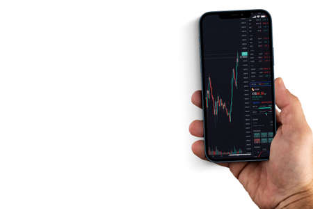 Male hand holding a smartphone with financial stock market graph. Stock Exchange. White Background.