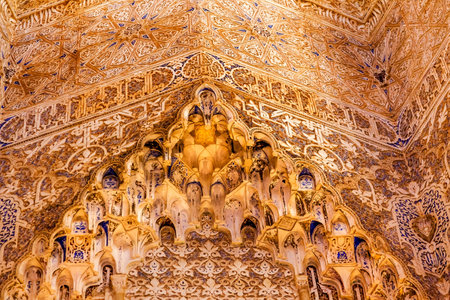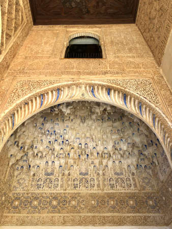 Ceiling with intricate sculpted details of moorish arabian origin / influence, astonishing level of patterns.Ancient beautiful moorish stucco work of Alhambra, Granada