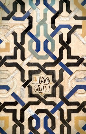 Islamic text engraved on a wall surrounding by a beautiful moorish pattern in ceramic