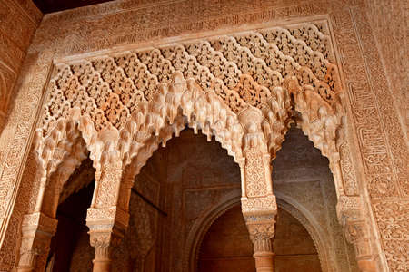 Granada, Spain - May 10, 2018: finely chiseled archs within the city of the Alhambra
