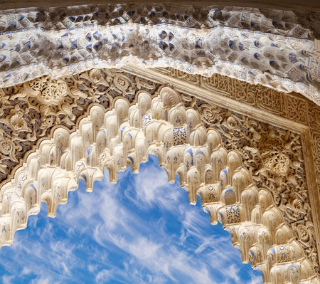 GRANADA, SPAIN - SEPTEMBER 25, 2019: Intricate sebka plasterwork and mocarabe arch decor of Comares Palace with a view on Court of Myrtles, Nasrid Palace, Alhambra, on September 25 in Granada