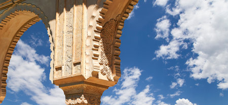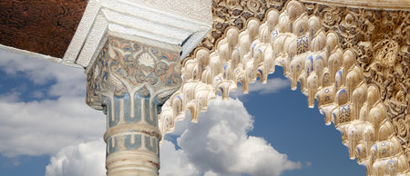 Arches in Islam (Moorish) style (against the background of a beautiful sky with clouds) in Alhambra, Granada, Spain