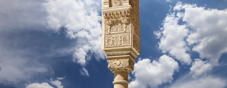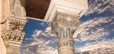 Columns in Islam (Moorish) style in Alhambra (against the background of a beautiful evening sky with clouds), Granada, Spain