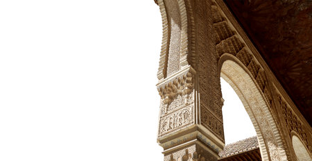 Beautiful ancient islamic architecture style details an arc and columns into lions yard