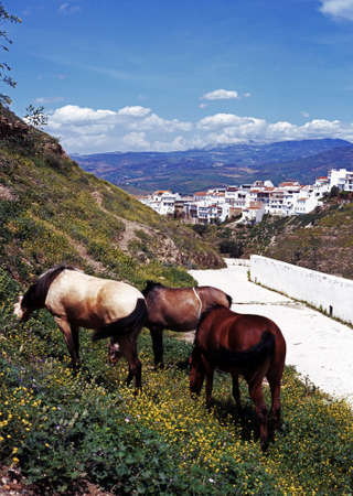 Wild horses grazing near the castle, Alora, Malaga Province, Andalucia, Spain, Western Europe