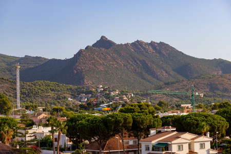Mountains. Desert of Las Palmas seen from the town of Benicasim, in Castellón. Mountainous and rocky system with green trees throughout the rocky extension, in Spain. Europe. Horizon