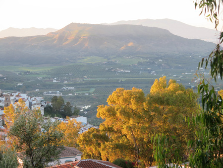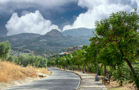 Sun shining over Alora countryside, Andalusia viewed from hilltop road