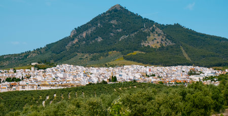 a panoramic view of Archidona, a small town situated at the base of a mountain, in the province of Malaga, Spain, on a sunny spring day